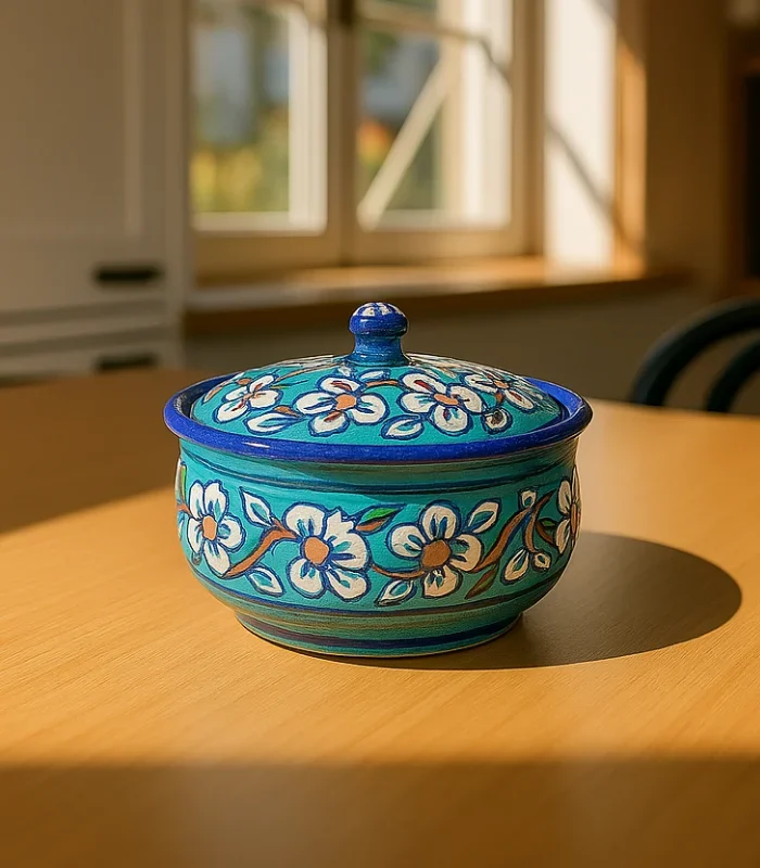 The Bloom Serving Dish is a fine piece of hand-painted Hala pottery, showcasing vibrant cobalt blue tones and intricate floral patterns. Crafted by skilled Pakistani artisans, this ceramic dish beautifully merges tradition and elegance. Ideal for serving desserts, snacks, or festive treats, it also works as a decorative centerpiece, enhancing dining tables and kitchens alike. Each dish celebrates authentic Pakistani pottery craftsmanship, making it both functional and timeless.