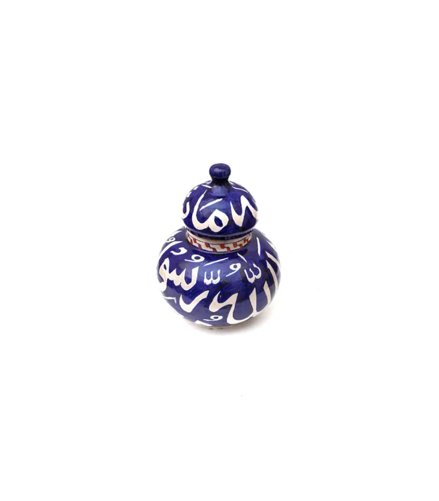 The Blue Glazed Calligraphy Jar is a stunning piece of handcrafted Sindhi pottery, featuring intricate Islamic calligraphy-inspired patterns in a bold blue glaze. Made by skilled artisans in Sindh, Pakistan, this ceramic jar reflects cultural heritage and timeless artistry. Perfect as a decorative jar, storage container, or centerpiece, it adds elegance to living rooms, dining areas, and offices. With its detailed craftsmanship, it stands as an authentic example of Pakistani ceramic art.