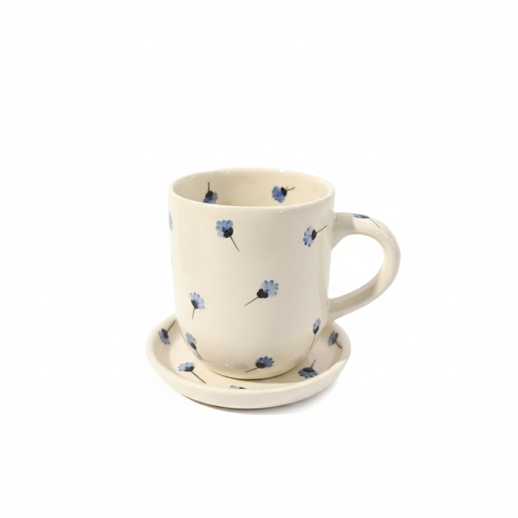 Hand-painted with tiny, graceful blue blossoms—reminiscent of delicate cornflowers or forget-me-nots—each mug features a simple, repetitive pattern against a soothing cream background.