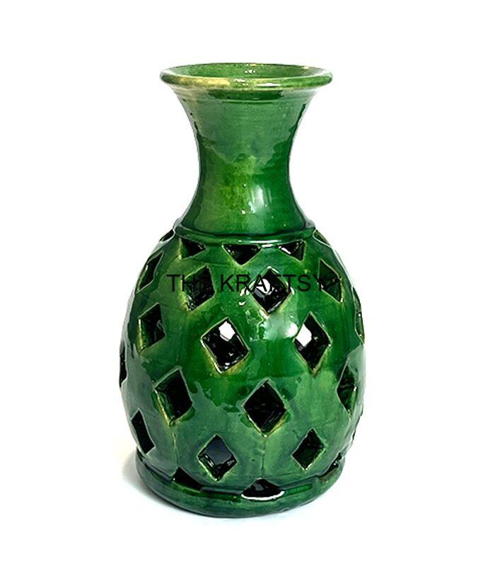 Add a splash of vibrant, natural color to your home with the Emerald Lattice Vase. This stunning piece features a rich, deep green glaze and an intricate, hand-carved diamond openwork design that creates a beautiful play of light and shadow.