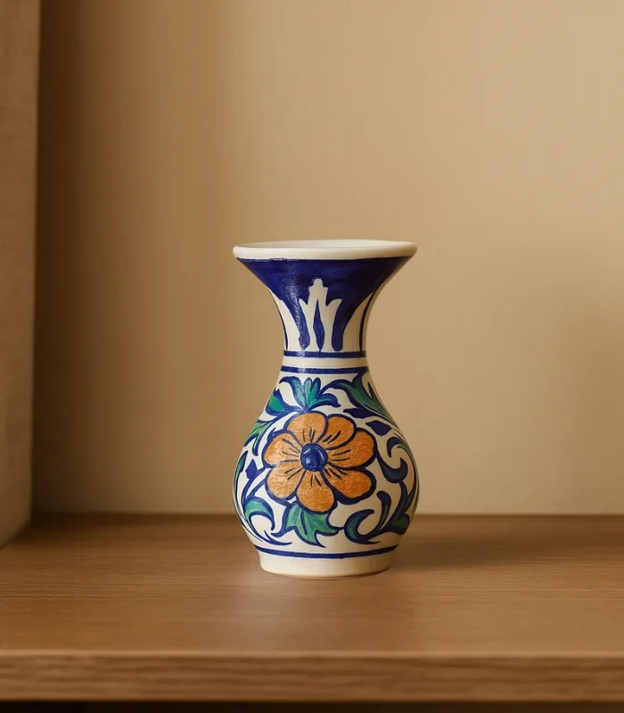 Transform your décor with this masterfully crafted ceramic vase from Sindh, where intricate florals bloom in stunning blues and peaches. Each hand-painted piece brings authentic artisanal beauty and graceful charm to your living space.