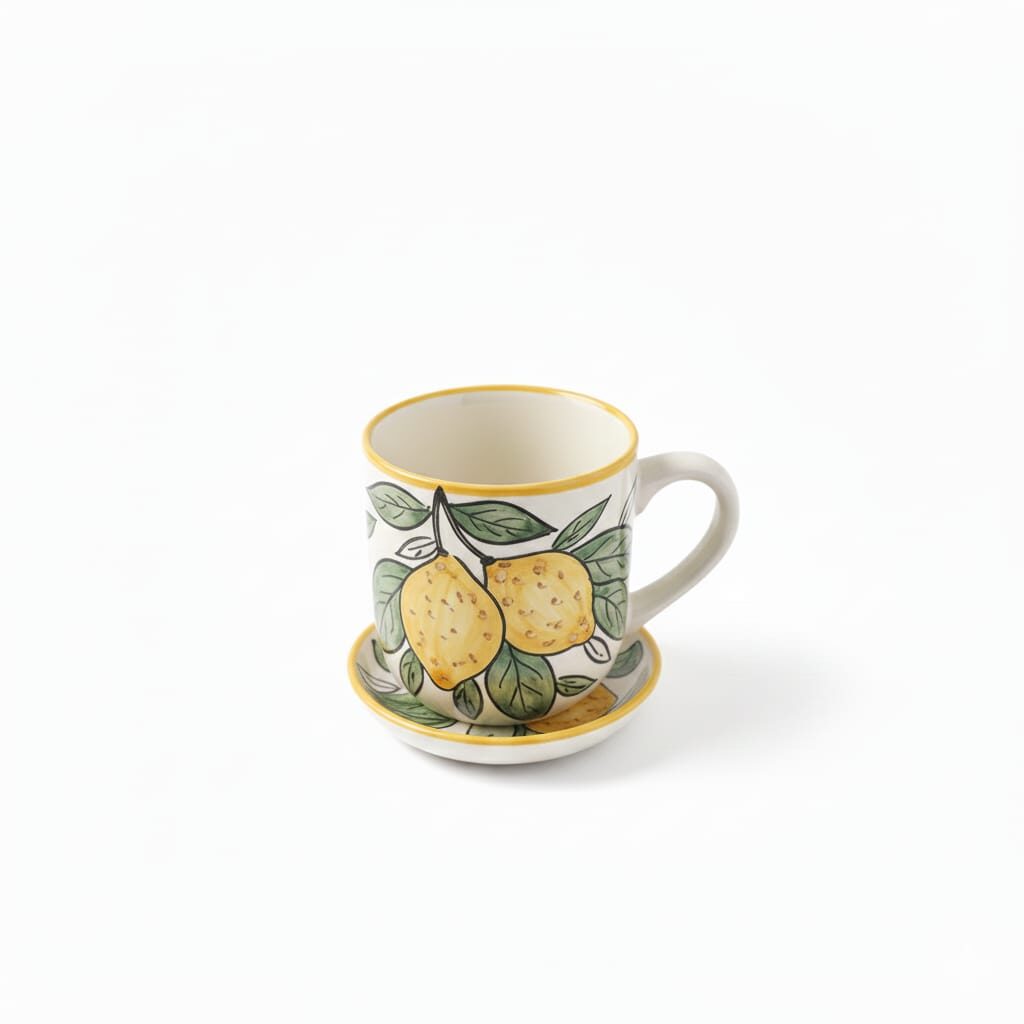 ​Vibrant Citrus Motif: The design features lush, yellow lemons and verdant green leaves, evoking the freshness of a summer orchard. The rim of both the mug and coaster is accented with a cheerful yellow band.