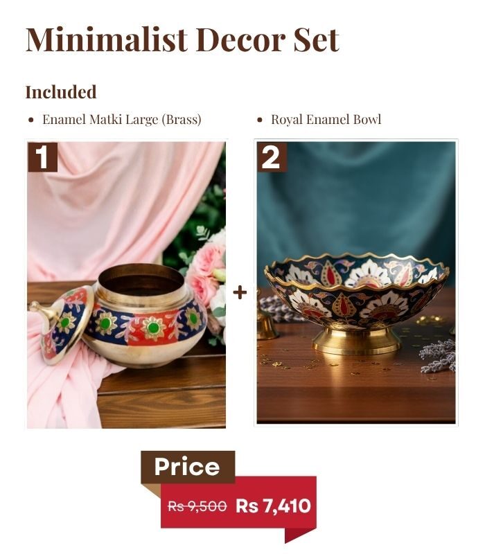 Bring minimalist elegance to your home with the Kraftsy Minimalist Decor Set, a limited edition 11.11 release. Featuring a large brass enamel matki and a royal brass enamel bowl, this set is perfect for modern interiors, table styling, and home gifting. Crafted with attention to detail, these artisanal pieces blend classic design with contemporary flair. Make your space stand out with this exclusive home décor set.