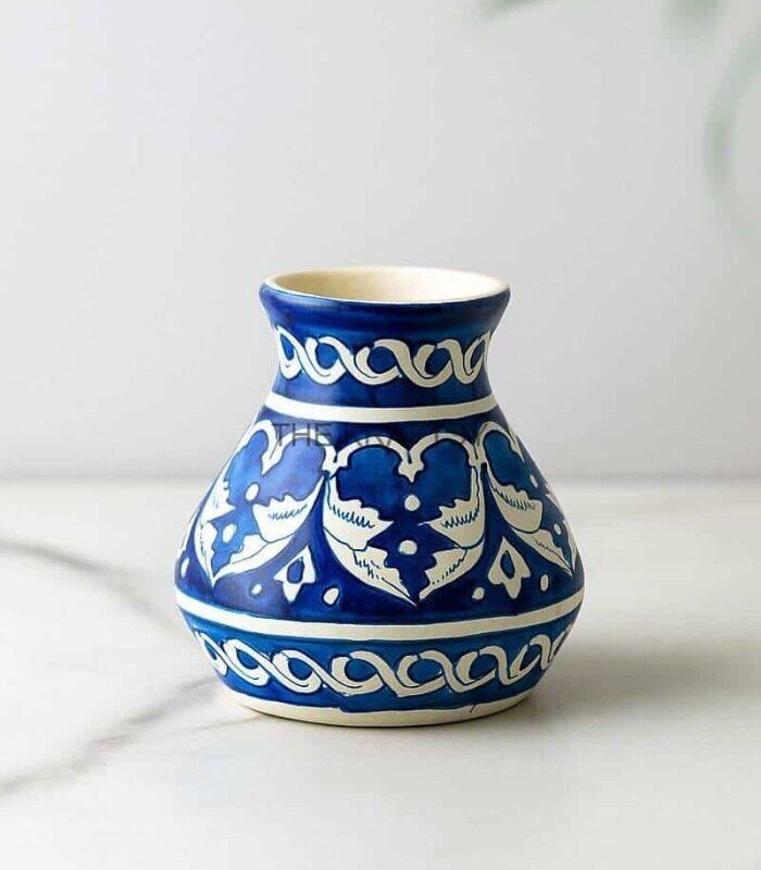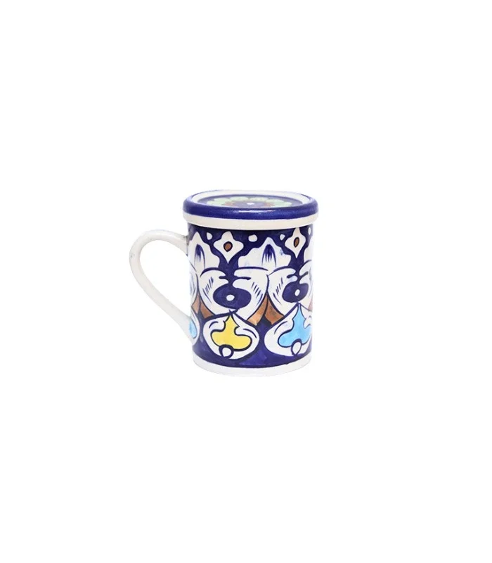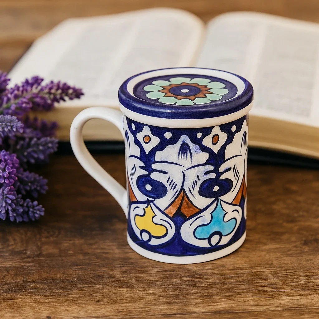 Celebrate Pakistani craftsmanship with this hand-painted ceramic mug and matching lid, adorned with bold navy and cobalt motifs and bright yellow highlights on a clean white base. Ideal for everyday tea or as a lively display piece, the fitted lid helps retain heat and keeps your drink protected from dust.