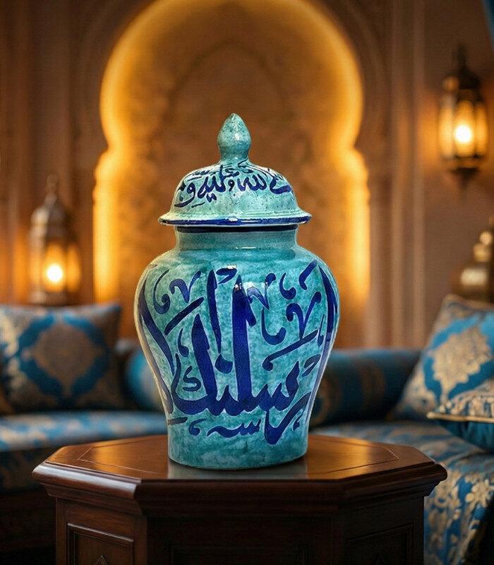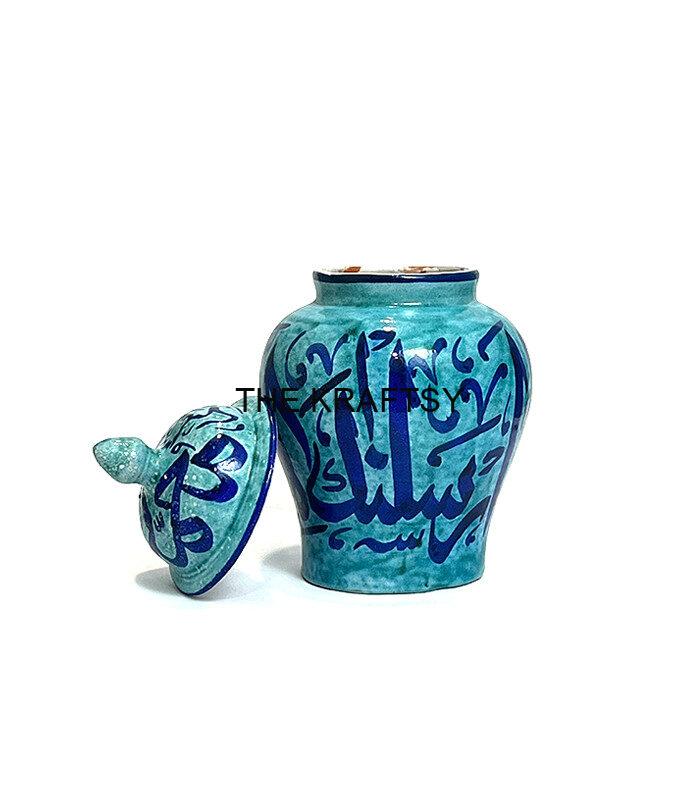 Immerse your space in cultural charm with a handcrafted Sindhi ceramic jar, beautifully adorned with intricate calligraphic patterns in a vibrant turquoise glaze. A perfect blend of artistry and functionality, this unique piece celebrates the rich traditions of Sindh, Pakistan, while adding a sophisticated touch to your home.