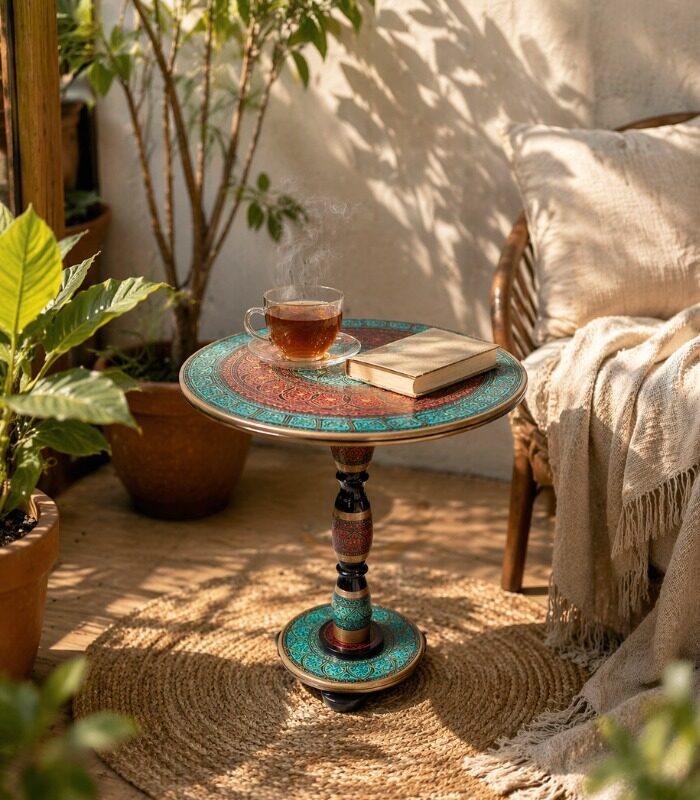 Transform your space with this masterfully crafted wooden side table, showcasing mesmerizing red and gold circular patterns by Punjab’s expert artisans. Each piece is a unique work of art that adds timeless elegance while serving as a versatile accent table.