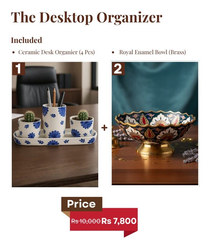 Upgrade your workspace with the Kraftsy Desktop Organizer, part of the 11.11 limited edition drop. This set includes a 4-piece ceramic desk organizer and a royal brass enamel bowl, combining practicality with artisanal charm. Perfect for home offices, work desks, or gifting, it keeps essentials organized while enhancing your desktop décor with a touch of elegance.