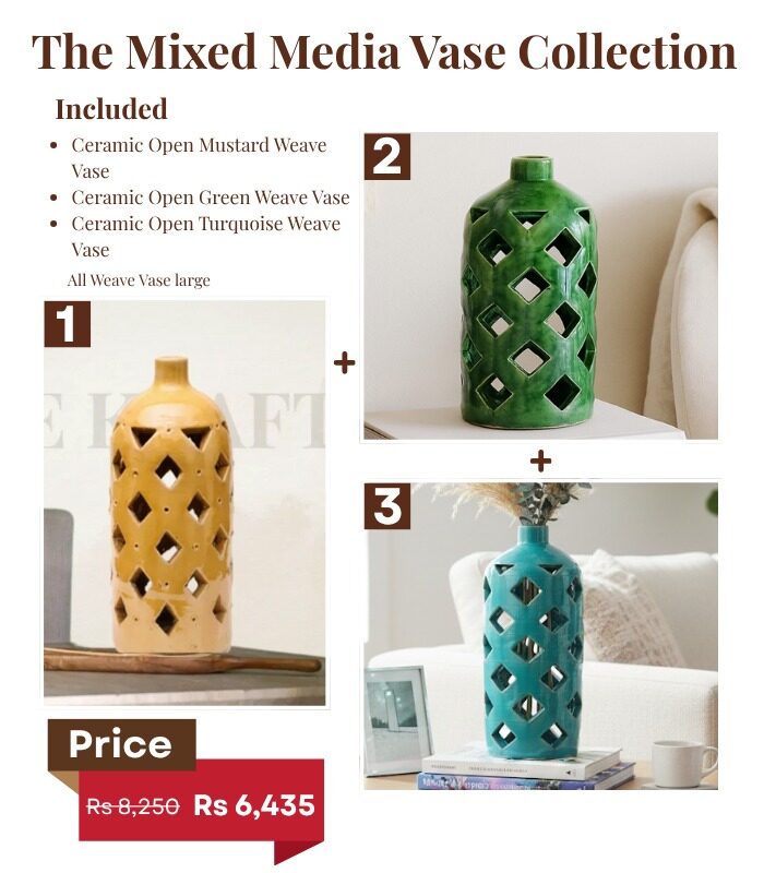 Add a pop of color and texture to your home with the Kraftsy Mixed Media Vase Collection, a limited edition 11.11 release. This set features large ceramic open weave vases in mustard, green, and turquoise, perfect for flower arrangements, table styling, or decorative displays. Designed to blend contemporary and artisanal aesthetics, these vases are a must-have for stylish home décor enthusiasts.