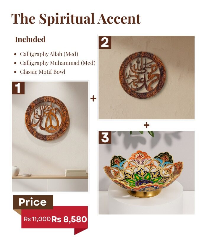 Add divine elegance to your home with the Kraftsy Spiritual Accent, a limited edition 11.11 collection celebrating faith and artistry. This exclusive set includes two wooden Islamic calligraphy wall hangings — Allah and Muhammad (medium size) — paired with a classic brass motif bowl that complements any sacred or living space. Crafted with care and reverence, it’s perfect for Ramadan décor, spiritual gifts, or creating a peaceful home corner.