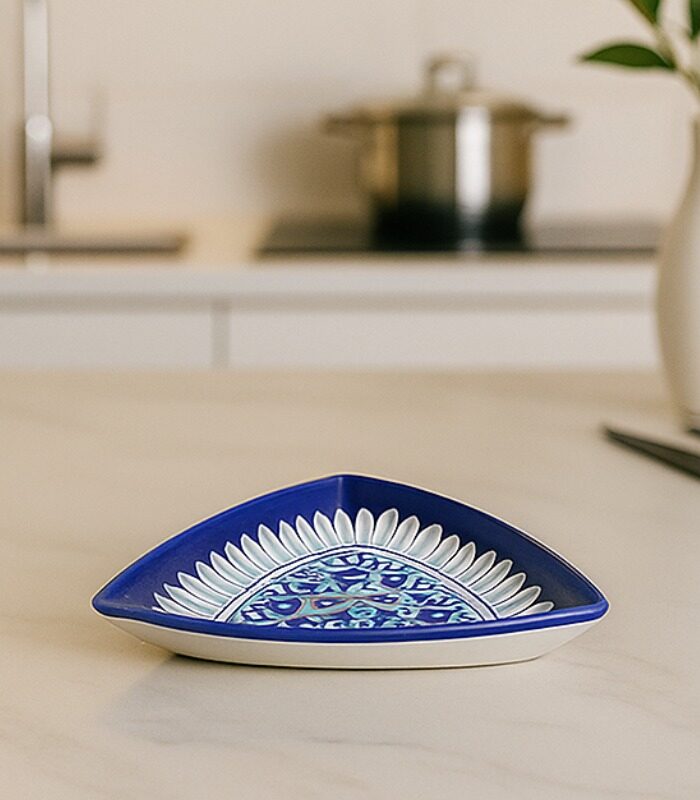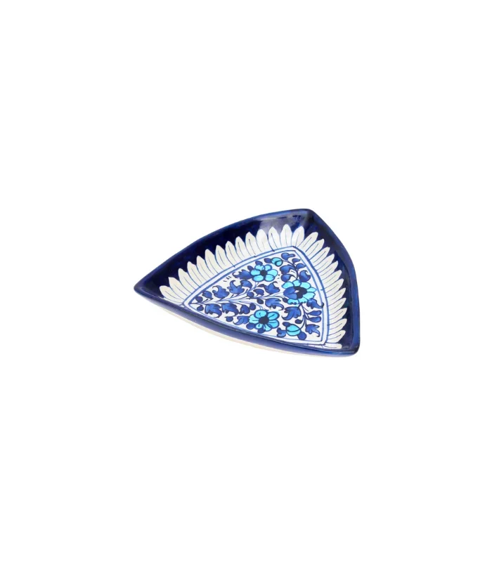 Unique triangular ceramic platter featuring intricate blue and white hand-painted designs by Multan’s master artisans. This versatile piece adds distinctive elegance to your table whether serving delicacies or displayed as a decorative accent.