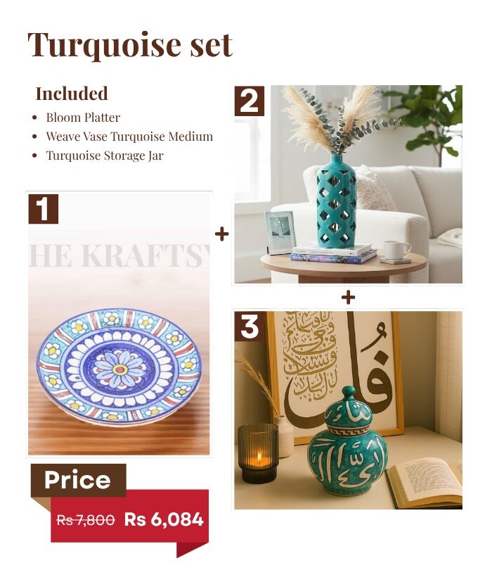 Bring cohesive style and functionality to your home with the Kraftsy Turquoise Set, an exclusive 11.11 drop. This set includes a bloom platter, a medium turquoise weave vase, and a turquoise storage jar, ideal for tabletop styling, home organization, and gifting. Crafted with attention to detail and artisanal design, this set adds a splash of turquoise elegance to any space.